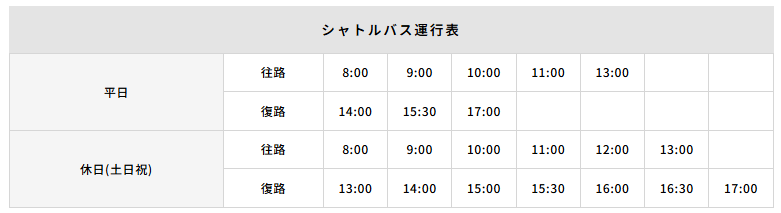 シャトルバスの運行時間は下記の運行表をご確認ください。